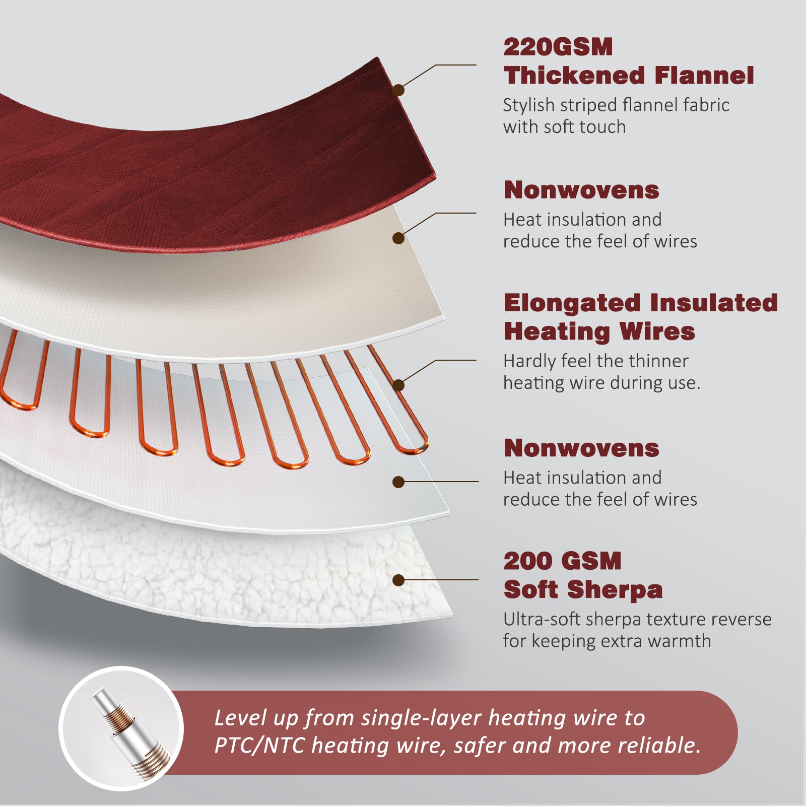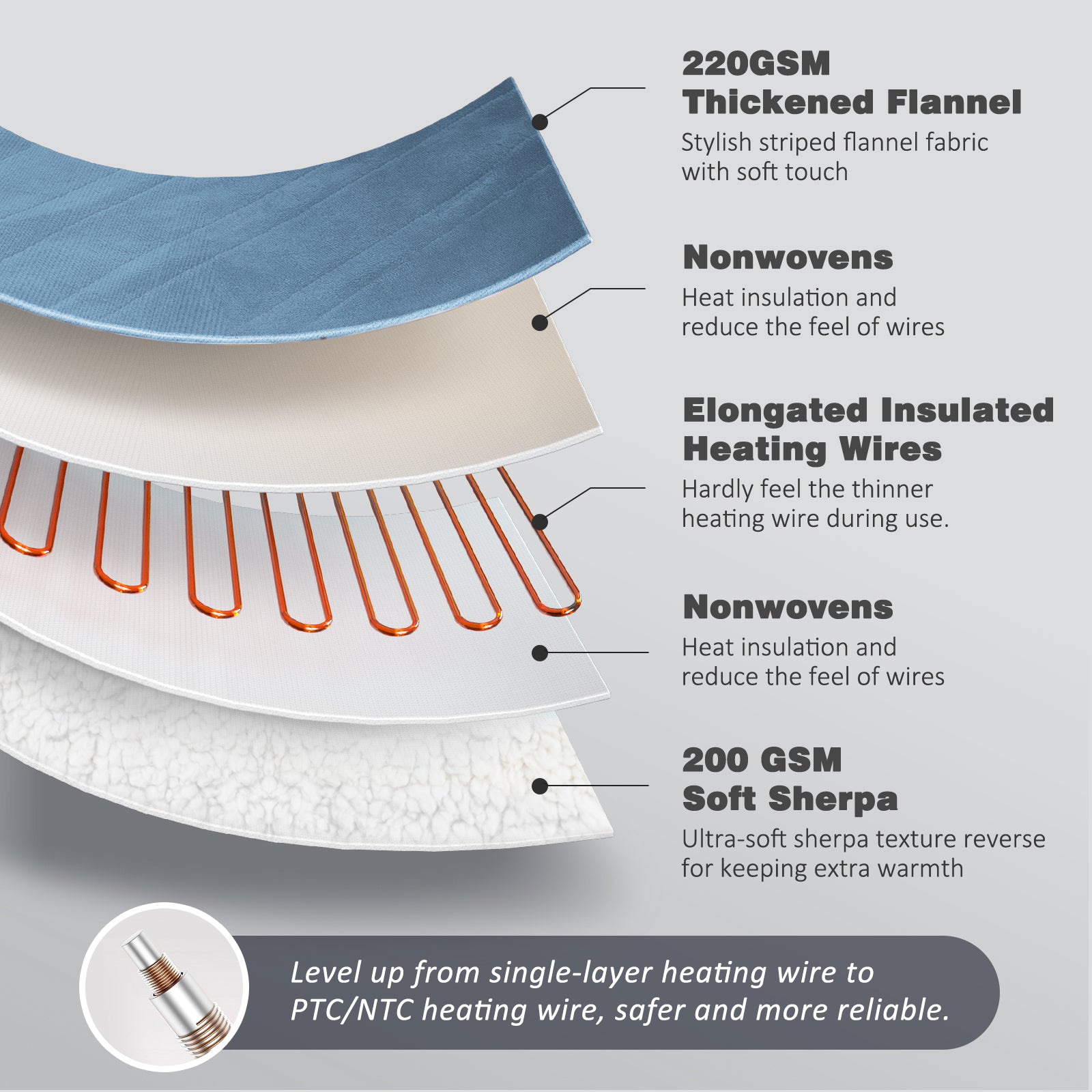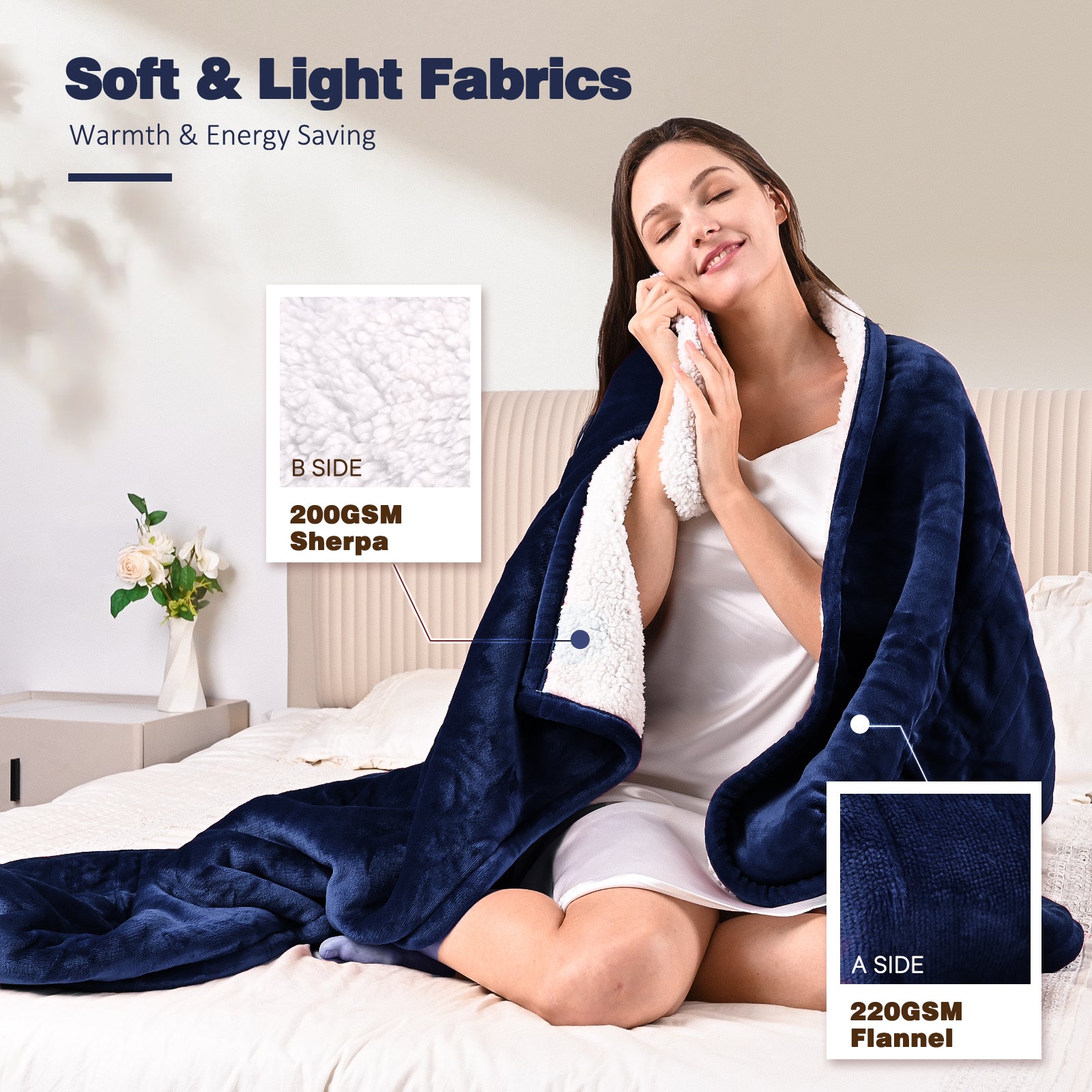 **Experience Unmatched Warmth**:Immerse yourself in the luxurious comfort of our Fluffy Heated Lounge Blanket, meticulously crafted from a fusion of premium 200gsm flannel and 180gsm sherpa fabric. This dynamic duo offers not only exceptional heat permeability but also unparalleled heat retention. With a texture as inviting as a warm embrace, this blanket becomes your ultimate cocoon of comfort. Measuring a generous 62"x84", it ensures you're enveloped in cozy warmth that shields you from even the coldest of days.